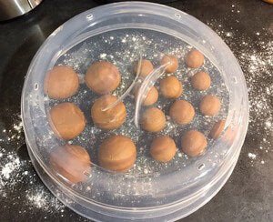 22. After the fermentation reaches about 1.5 times the size, gently press the chicken leg with your fingers. The dough is soft and can be steamed after it rebounds slowly. Steam on high fire, and time after the water boils ⌛ The fire can be stopped after 10 minutes, and the lid can be uncovered after 5 minutes of steaming. In fact, the finished product in the picture is slightly lacking in fermentation, and its surface is relatively rough.