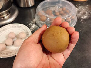 3. Divide the 150g filling into 6 equal portions, 25g each, knead round and cover with plastic wrap and refrigerate for standby.
